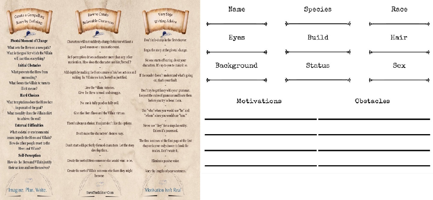 Save $ and buy both at once! Pack of 5 Writing Advice (Postcard Size) printed in color to look like old parchment. Pack of 20 Character Attribute Cards (Postcard Size) printed in Black and White. 4.25″ x 5.5″